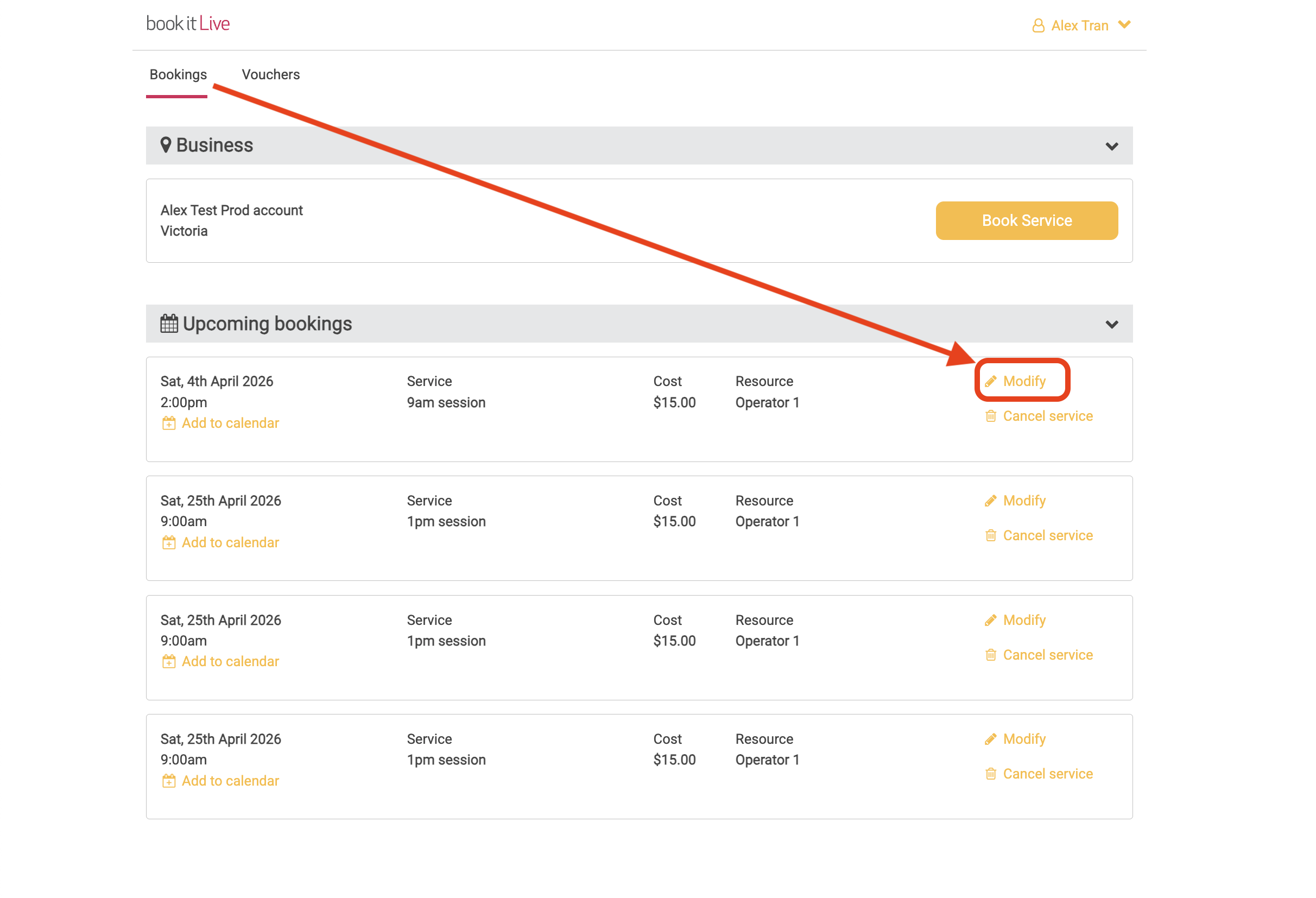 Note: The Business can set booking rules that will restrict booking from being Modified within a set period prior to the booking time. When these rules apply there will be no "Modify Booking" link displayed against the booking.